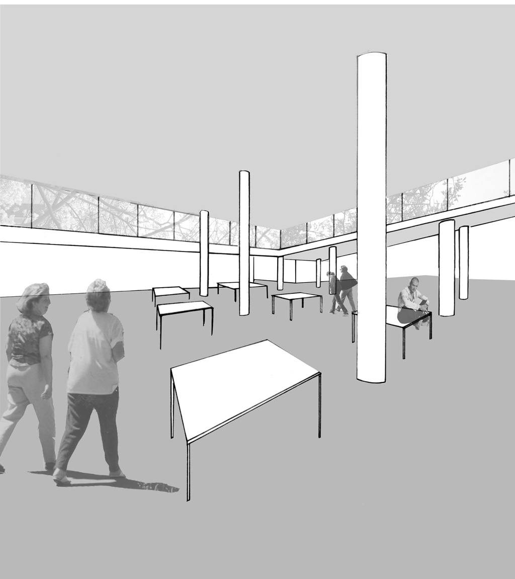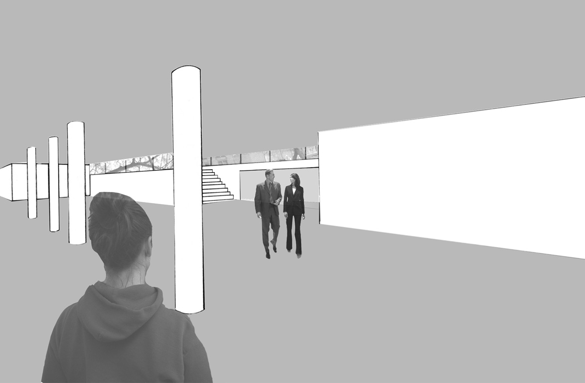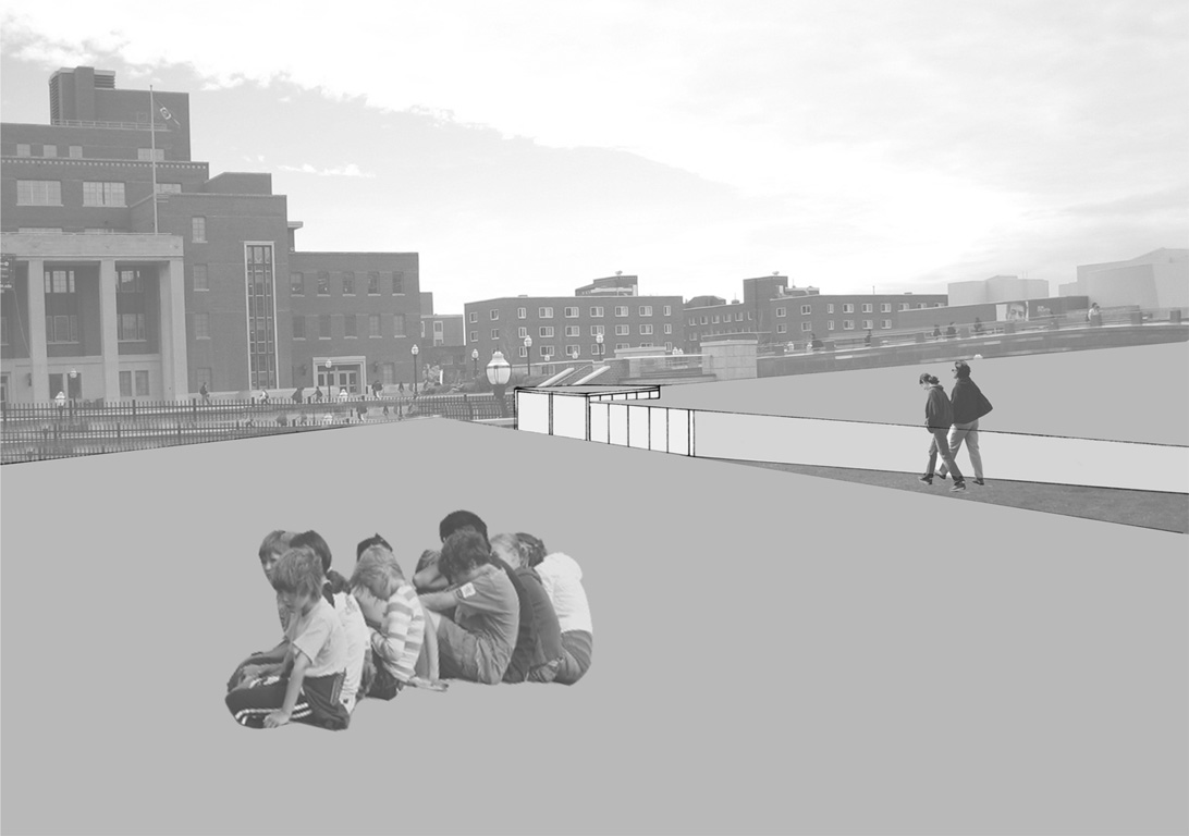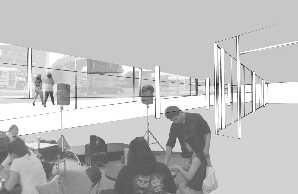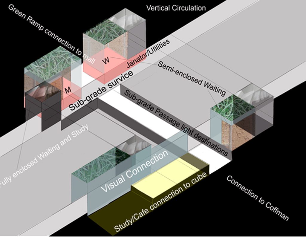 The site of this project is located on the University of Minnesota Twin Cities Campus in Minneapolis Minnesota. The bus stop in front of Coffman Memorial Union is a temporal space. It represents a transition between work and school--home and friends. In its existing condition the sites program is fragmented and defensive. Obstructed views and hard boundaries create an environment that is unwelcoming and disorienting. My design created a clear continuity of circulation defined by a clear line of site throughout the addition. This line of site helped create a more navigable and welcoming space