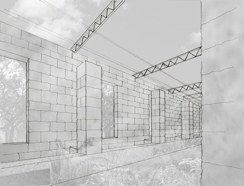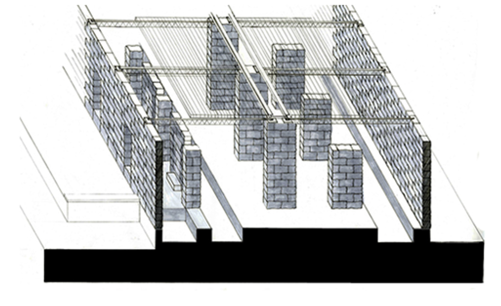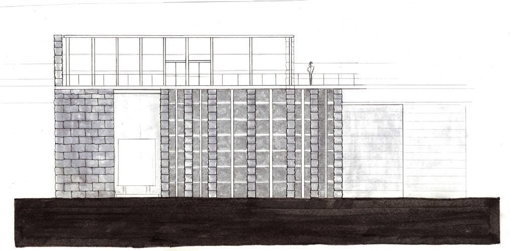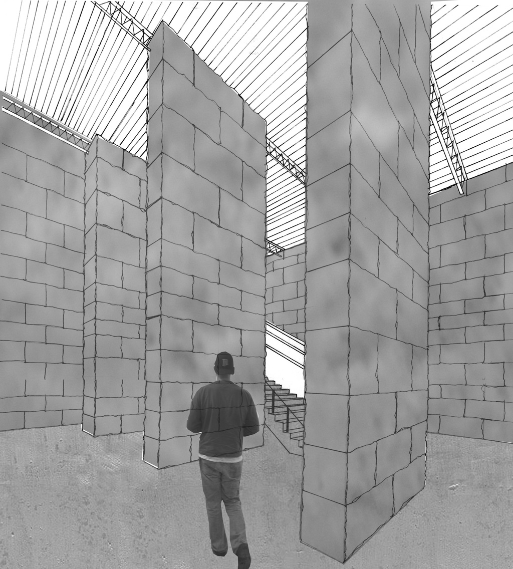 Due to the caved out nature of this site, my preliminary material choice was a local Minnesota dolomite limestone. Traditional bearing wall construction has reflected the stereotomic nature of the earth for centuries. A load-bearing wall tells a story of how it was constructed. To begin my design process I developed a series of program massing models and sketches. These drawings and models helped me refine the relationships of the site and provided fertile ground for the design, which followed. I wanted the material properties of the stone to reflect the existing site characteristics and create an environment that could change over time.