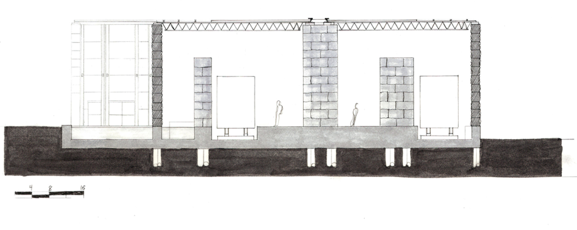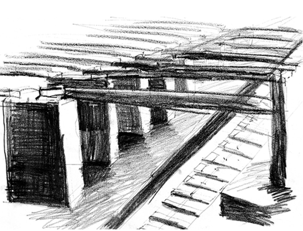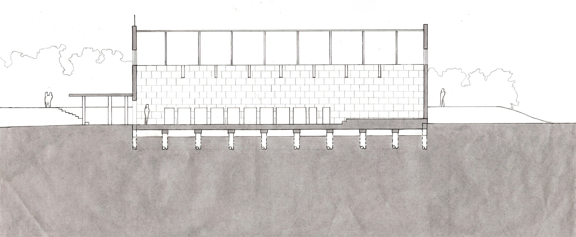 Due to the caved out nature of this site, my preliminary material choice was a local Minnesota dolomite limestone. Traditional bearing wall construction has reflected the stereotomic nature of the earth for centuries. A load-bearing wall tells a story of how it was constructed. To begin my design process I developed a series of program massing models and sketches. These drawings and models helped me refine the relationships of the site and provided fertile ground for the design, which followed. I wanted the material properties of the stone to reflect the existing site characteristics and create an environment that could change over time.