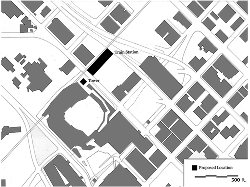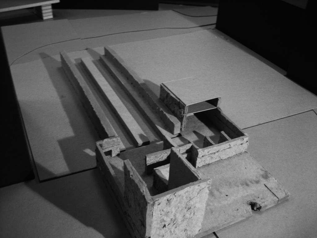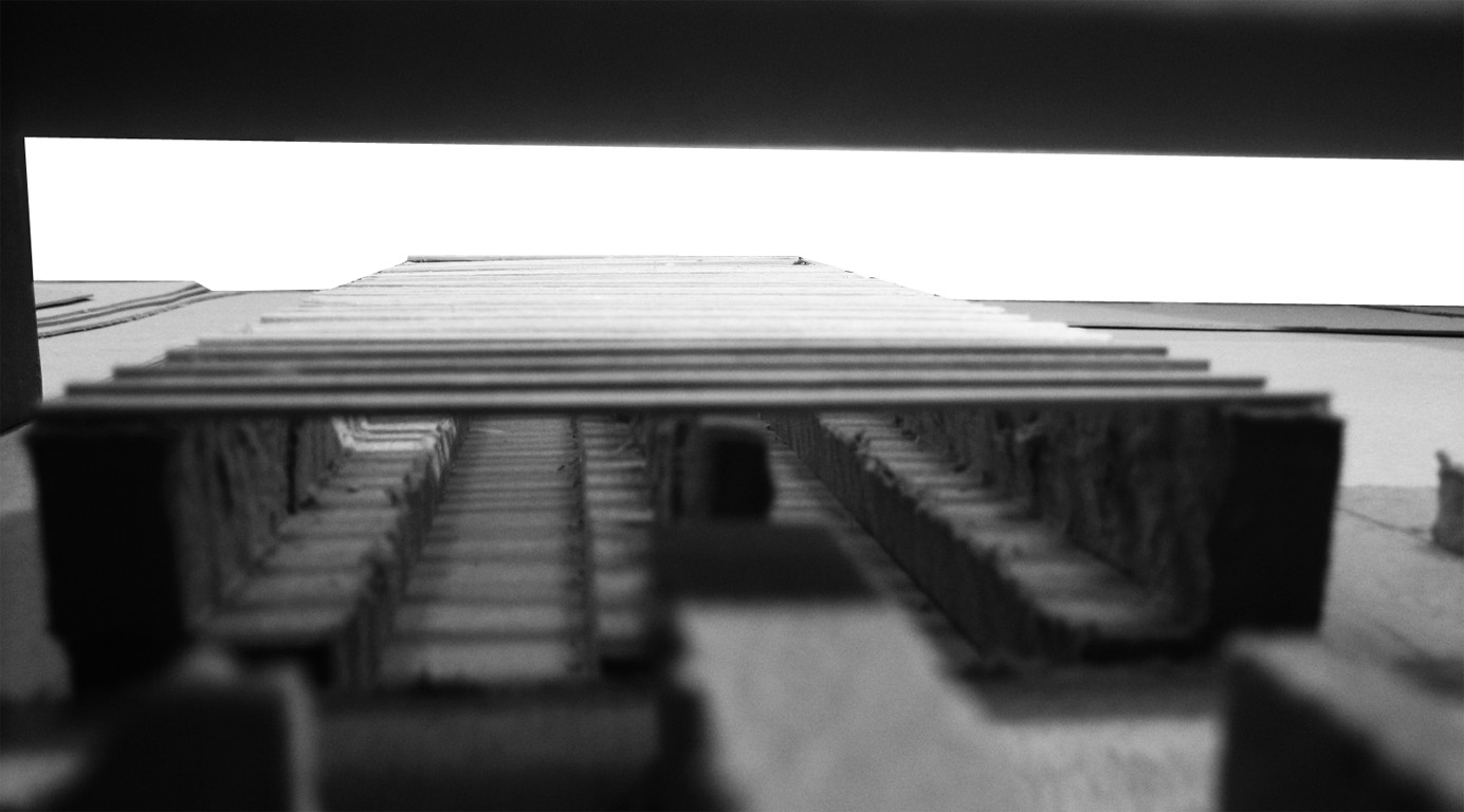 In this studio, we developed projects inspired from material properties and construction techniques. Our site was located at the terminus of the North Star Commuter Rail, Minneapolis Light Rail, and adjacent to the new Minnesota Twins baseball stadium. The layered nature of the site required negotiating two different elevations that of the overpass level where the light rail connects with the baseball stadium and that of the commuter rail at ground level. The derelict site existed in a carved out void where primary circulation corridors passed over the ground level without connecting to it. It was our primary project goal to compose a building to connect all the layers of the site based on our material choice.